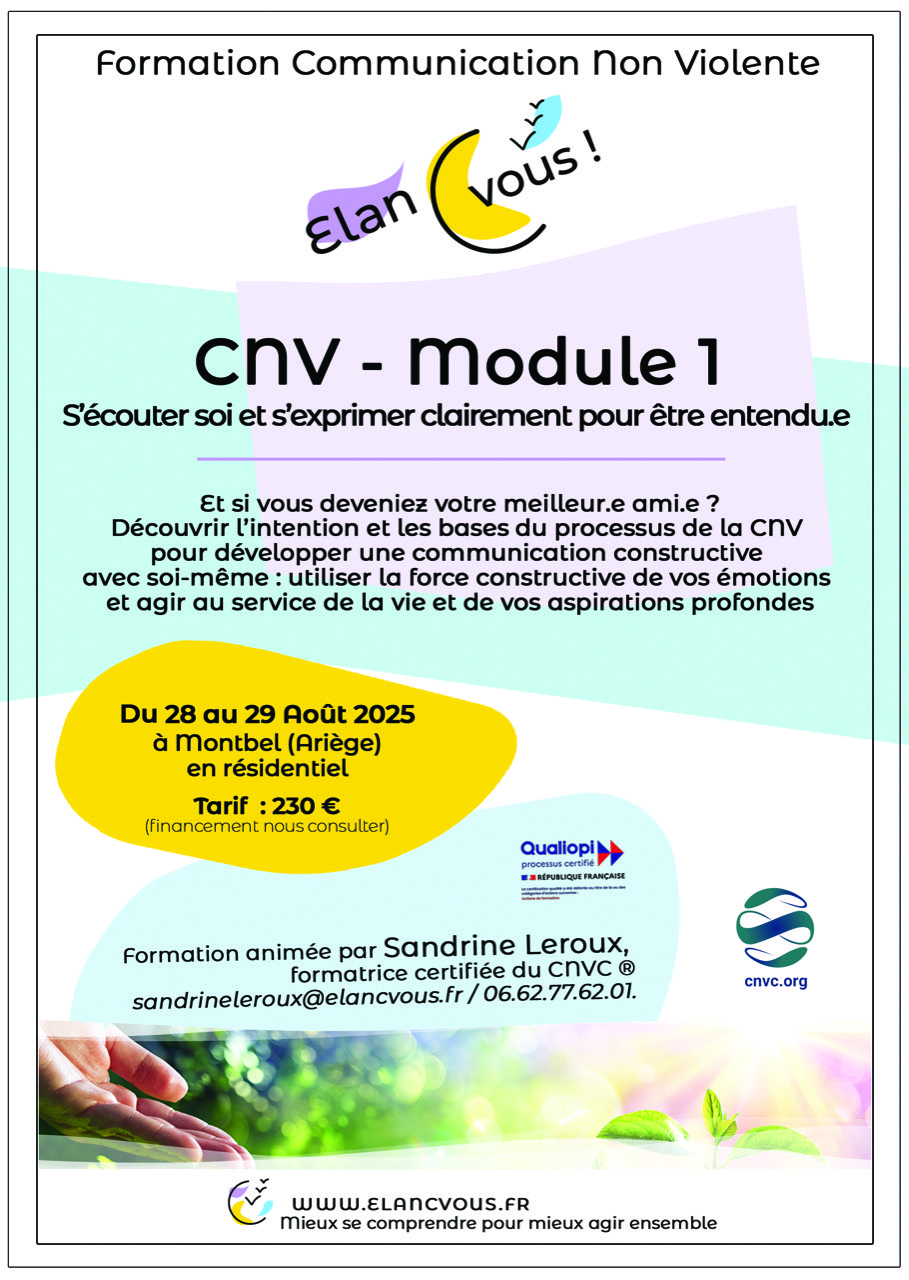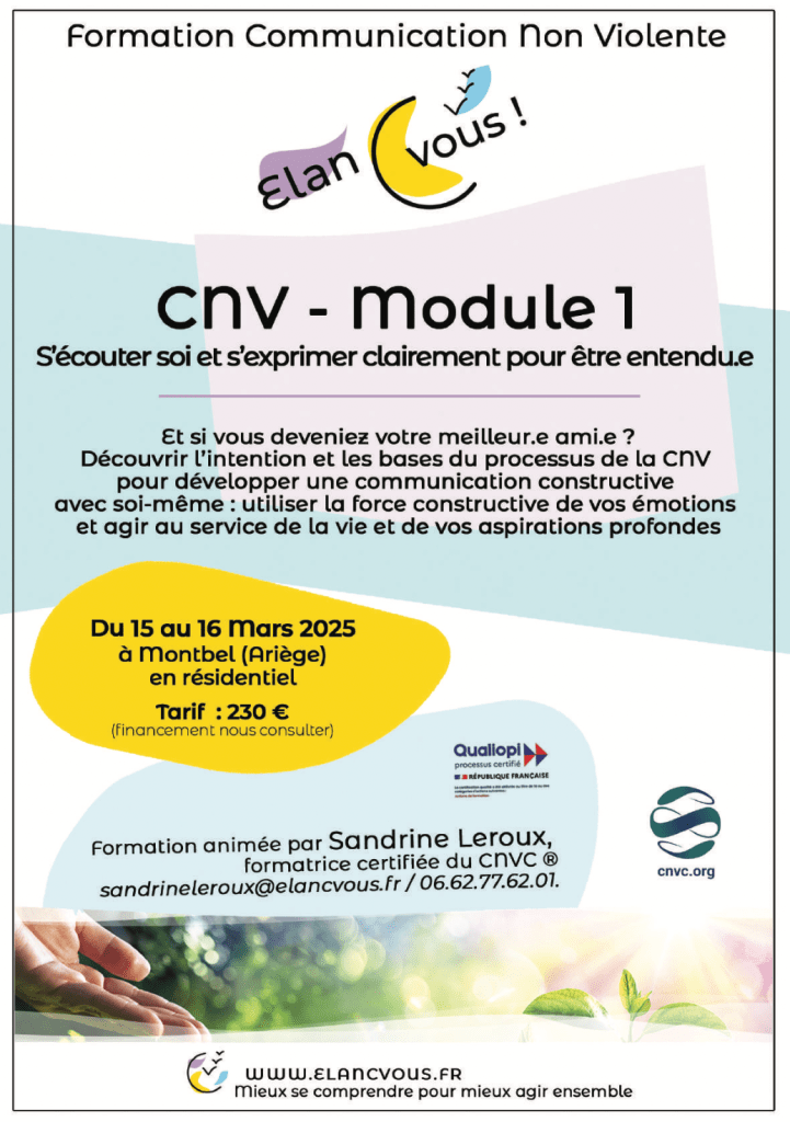 - Le module 3 (dernier des trois modules de base) de Communication NonViolente, les 31 janvier-1er février. Pré-requis : avoir participé aux deux premiers modules de base de CNV.